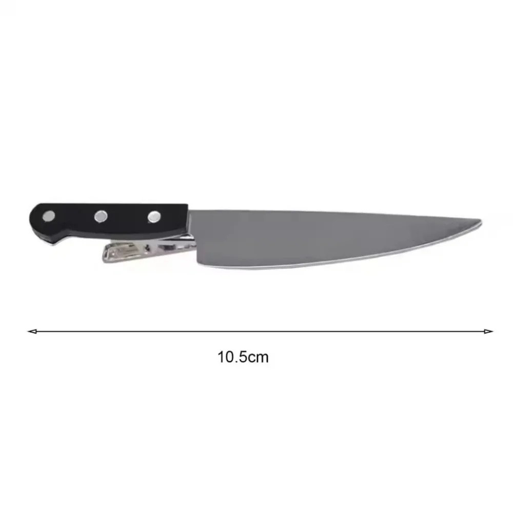 Alkuperäinen hiussolki, joka on muotoiltu keittiöveitsen mukaan, on näyttävä ja epätavanomainen lisä rohkeaan tyyliin. Realistinen terän ja kahvan muotoilu luo vaikuttavan visuaalisen efektin, joka heti kiinnittää huomion. Tämä on koristeellinen hiuskoriste, joka on tarkoitettu teematilaisuuksiin, ei oikea veitsi. Pituus noin 10,5 cm takaa näyttävän, mutta silti käytettävän efektin.