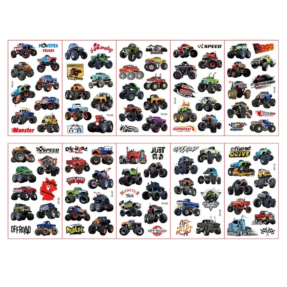 10 arkin sarja väliaikaisia tatuointeja jättimäisillä maastoautoilla, kuorma-autoilla ja kilpa-autoilla värikkäitä kehon tarroja.
