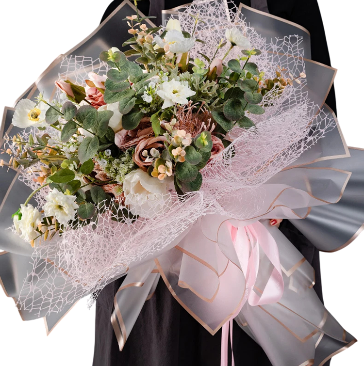 Tämä setti 10 arkkia lahjapaperia kukille tarjoaa tyylikkään ja käytännöllisen ratkaisun kaikille kukka-asettelun ystäville. Jokainen arkki on kooltaan 58 x 58 cm ja se on valmistettu laadukkaasta vedenkestävästä materiaalista, joka suojaa kukkia luotettavasti kosteudelta ja säilyttää niiden tuoreuden. Paperissa on ylelliset kultareunukset, jotka antavat jokaiselle kukkakimpulle ainutlaatuisen ja juhlavan ilmeen.
