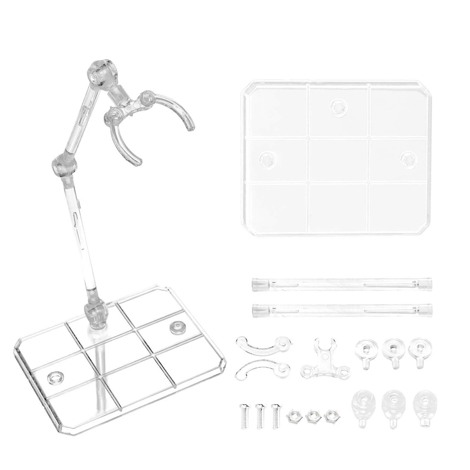 Läpinäkyvien telineiden sarja toimintahahmojen esittelyyn. Säädettävä rakenne nivelillä mahdollistaa vakaan kiinnityksen ja vaihteleva asento. Täydellinen kuvaus