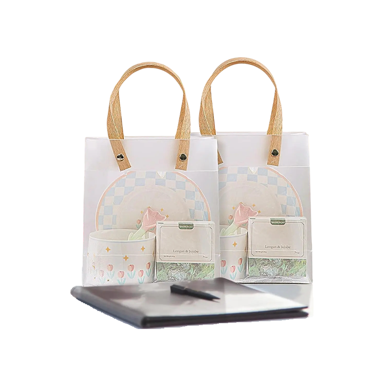 Lahjakassit PVC-materiaalista yhdistävät käytännöllisyyden ja eleganssin ja ovat täydellinen vaihtoehto paperipakkauksille. Läpinäkyvän muotoilun ansiosta voit esitellä lahjat houkuttelevalla tavalla ilman lisäpakkauksia. Kosteudenkestävyys takaa, että kassit pysyvät erinomaisessa kunnossa kuljetuksessa tai ulkoisissa tapahtumissa. Vaaleat kahvat antavat kokonaisilmeelle luksuksen ja hienostuneisuuden säväyksen.