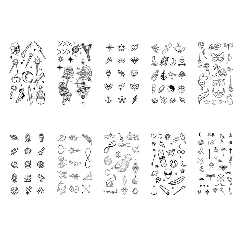 10 arkin setti vedenkestäviä väliaikaisia tatuointeja, joissa on hienoja kukka-, eläin-, symboli- ja muotovaihtoehtoja sormien, käsivarsien ja muiden kehon osien koristelemiseen. Täydellinen kuvaus
