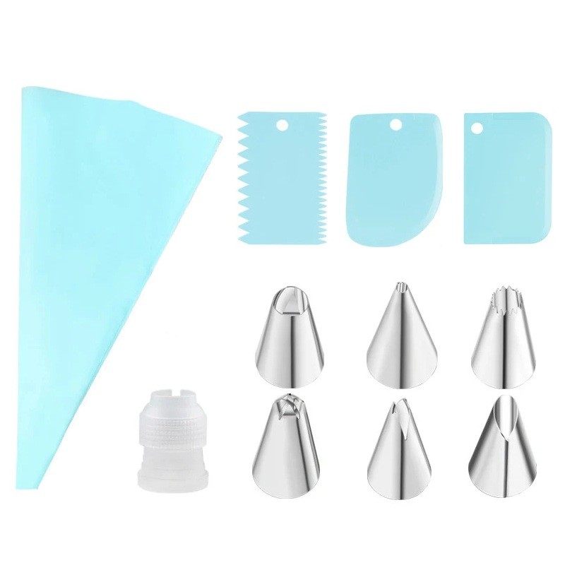 11 osan leivontatyökalusarja kakkujen koristeluun, suuttimet, pussi, liitin, lastat, leivontatarvikkeet kotikäyttöön ja ammattilaisille