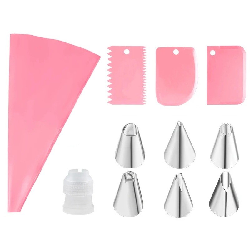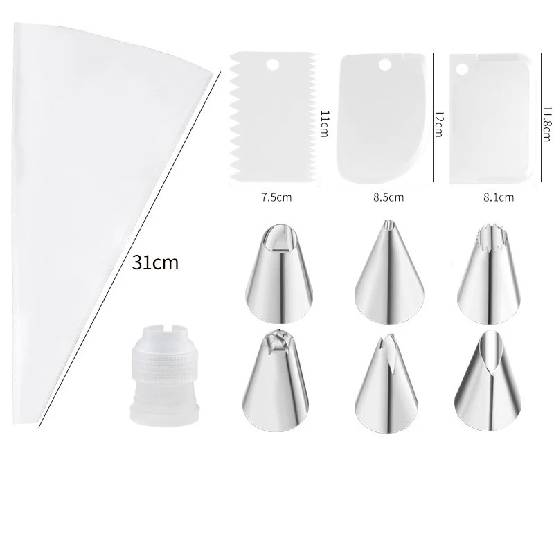 Jos etsit edullista mutta kattavaa varustusta kakkujen koristeluun, tämä 11-osainen sarja on erinomainen ratkaisu. Se mahdollistaa puhtaiden viivojen, eleganttien muotojen, kukkakoristeiden ja kakkujen sileiden pintojen luomisen. Käytännöllisen yhdistelmän suuttimia, lastoja ja laadukasta pussia ansiosta saat monikäyttöisiä työkaluja, joita voit hyödyntää jokaisessa leivonnassa. Tämän sarjan avulla voit helposti koristella perheelle, ystäville tai luoda hienostuneita jälkiruokia juhlatilaisuuksiin. Työskentely sarjan kanssa on helppoa, tarkkaa ja tulokset näyttävät erittäin ammattimaisilta – vaikka koristelisit ensimmäistä kertaa.