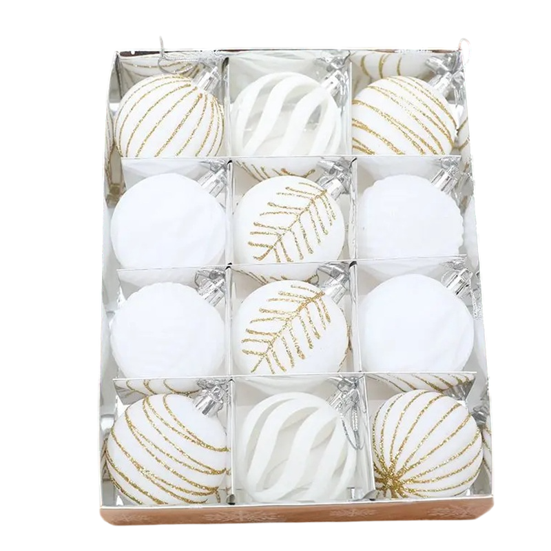 Jokaisen pallon halkaisija on 6 cm, mikä on yleinen koko useimmille joulukuusille. Yksittäisten pallojen pakkausmitat ovat 6 x 6 x 7 cm. Kuusi erilaista koristetta tuo koristeluun syvyyttä ja visuaalista monimuotoisuutta, kun taas 12 kpl koristeita mahdollistaa tasapainoisen sijoittelun. Setti sopii paitsi joulukuusen koristeluun, myös seppeleiden, girlandien, ikkunakoristeiden tai juhlallisten pöytien koristeluun. Klassinen muoto sopii sekä perinteisiin että moderneihin sisustuksiin.