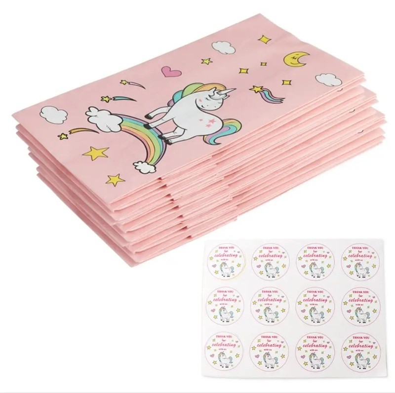 - Pakkauksen sisältö: 12 kpl vaaleanpunaisia kraft-pusseja yksisarviskuvioilla