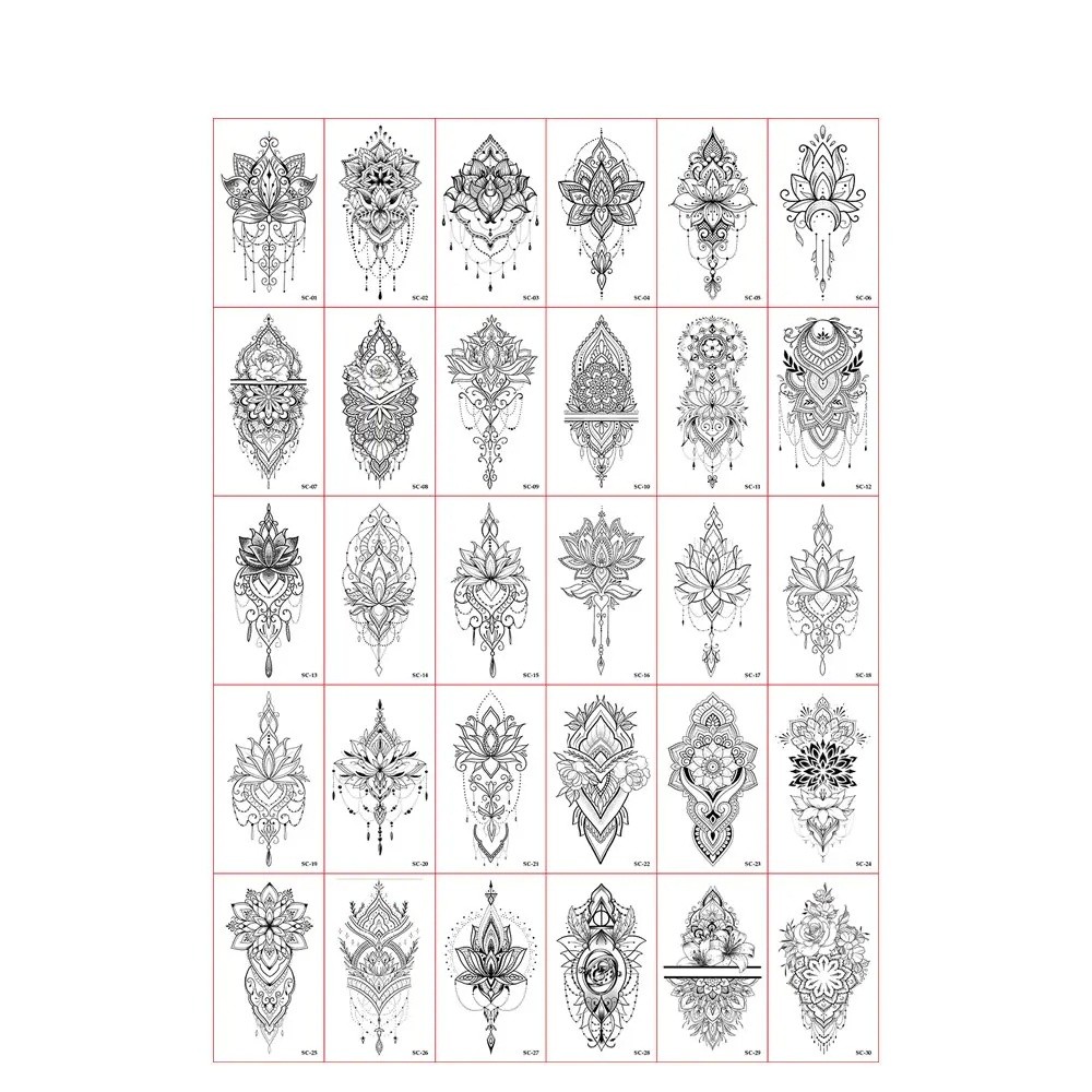 Tyylikäs sarja mandala- ja lotus-väliaikaisia tatuointeja koristeellisilla kuvioilla tyylikkään ja harmonisen ilmeen saavuttamiseksi. Täydellinen kuvaus