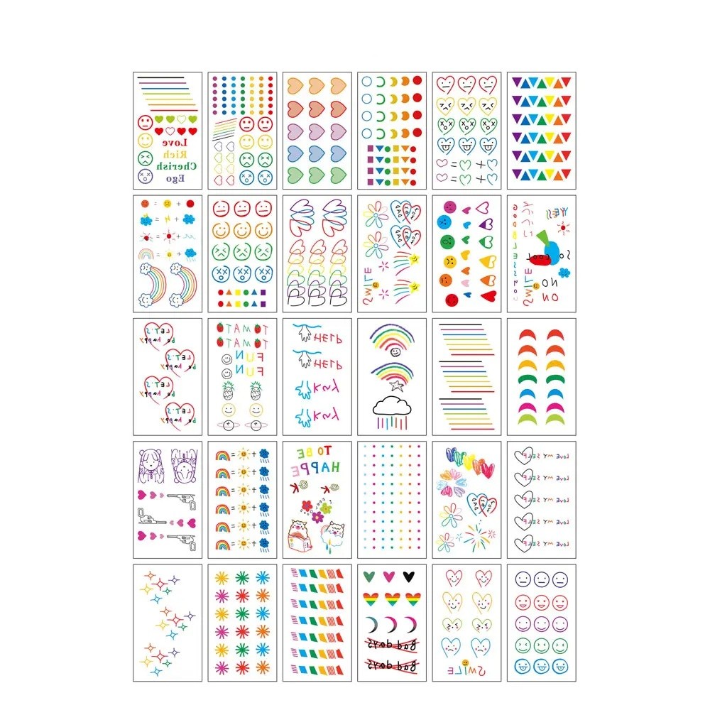 30 kappaleen väliaikaisten tatuointien setti 5,7 x 9,7 cm värikkäitä sydän, tähti, kuu, hymiö, sateenkaari ja lasten piirretyt motiivit