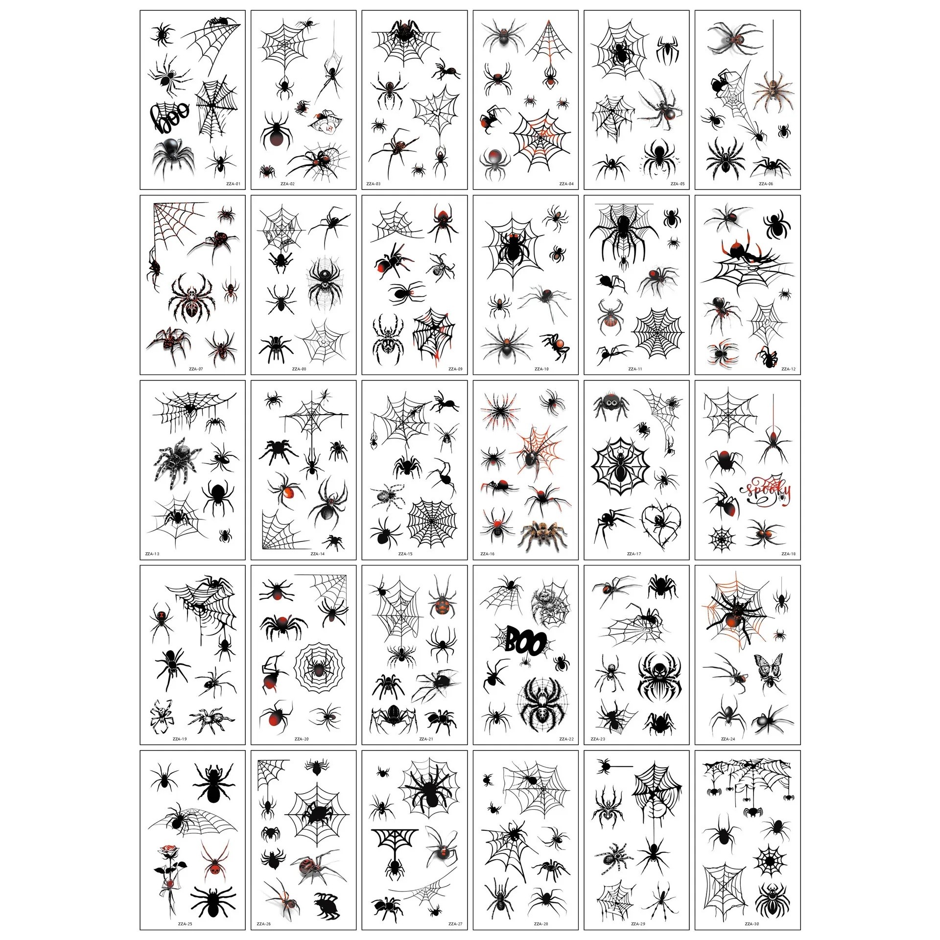 • 30 arkkia väliaikaisia tatuointeja hämähäkkien ja hämähkinseittien kuvastoilla