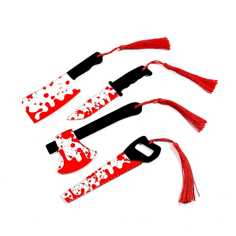 Viiden teemallisen kirjanmerkin setti on suunniteltu lukijoille, jotka rakastavat kauhutarinoita, jännittävää tunnelmaa ja keräilylisävarusteita kirjoille. Jokainen kirjanmerkki on 15 cm pitkä ja siinä on voimakas kauhuteema, joka on inspiroitunut elokuvien ja kirjojen estetiikasta – tyylitellyt muodot, jotka muistuttavat veistä, puukkoa, sahaa, machetea ja kirvestä. Lisätupsu auttaa löytämään nopeasti kesken olevan sivun ja antaa samalla kirjanmerkille koristeellisen ilmeen. Tuote toimii vain kirjanmerkkinä paikan merkitsemiseen kirjassa eikä sitä ole tarkoitettu muuhun käyttöön.