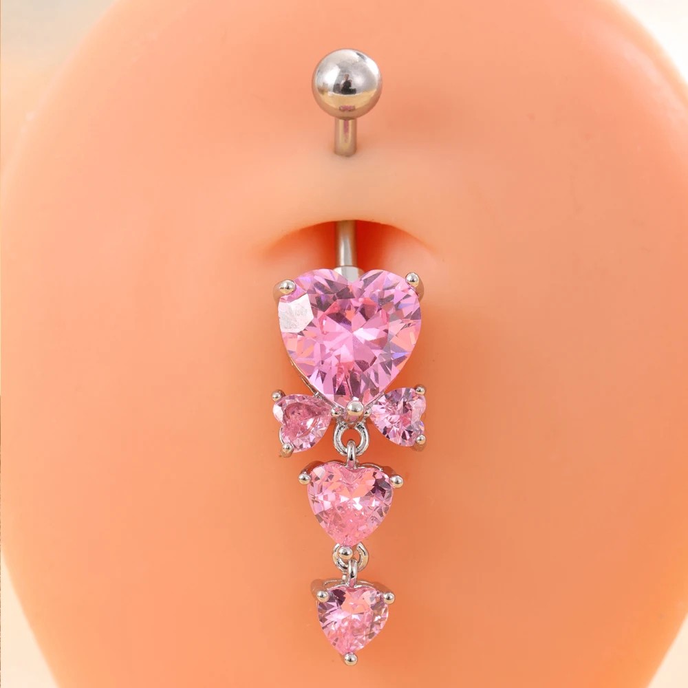 Hieno setti viidestä piercingistä vaaleanpunaisilla yksityiskohdilla, sydämillä, nauhoilla ja kimaltavilla kivillä, täydellinen jokapäiväiseen käyttöön ja kerrostamiseen. Täydellinen kuvaus