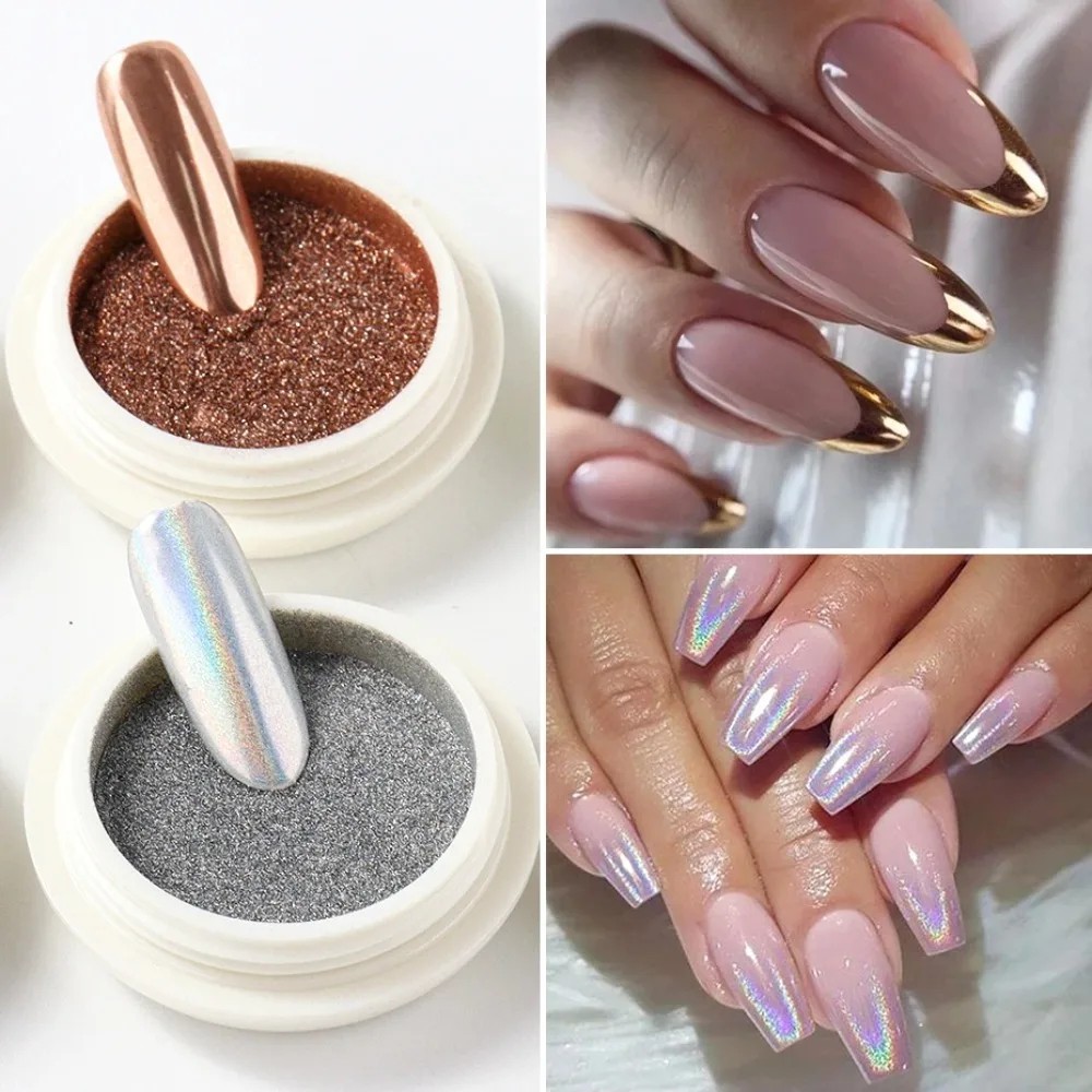 6 kromattisen peilipigmentin setti kynsille metallisen efektin luomiseksi kultaisena, hopeisena, ruusuna ja muissa väreissä, täydelliseen viimeistelyyn UV Top Coat kiinnityksellä. Täydellinen kuvaus