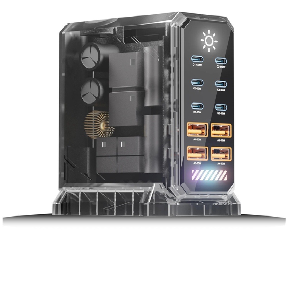Tämä erittäin tehokas latausasema, jonka kokonaisteho on 660 W, tarjoaa yleisen ratkaisun lukuisten elektronisten laitteiden lataamiseen mobiilipuhelimista tehokkaisiin kannettaviin tietokoneisiin. GaN-teknologian ansiosta saavutetaan parempi energiatehokkuus, alhaisempi lämpötila ja kompaktit mitat maksimaalisen tehon säilyttämiseksi. Kuusi USB-C-porttia tukee PD3.1, PD3.0 ja PPS -protokollia, mikä mahdollistaa laitteiden, kuten MacBook Pron, iPhone 16:n, Samsungin tai iPadin, lataamisen nopeasti ja vakaasti. Neljä USB-A-porttia tarjoavat nopeaa latausta QC3.0:n ansiosta, joten jopa kymmenen laitetta voidaan ladata samanaikaisesti. Integroitu vaihdettava LED-valo antaa asemalle modernin ilmeen ja tarjoaa visuaalisen yleiskuvan toiminnasta.