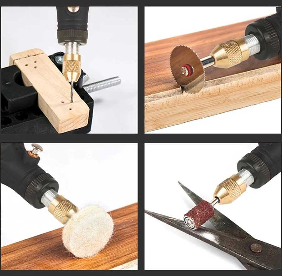 • Chuckin puristusalue 0,5–3,2 mm mahdollistaa hienojen poranterien, hiomakoneiden ja kiillotustarvikkeiden käytön