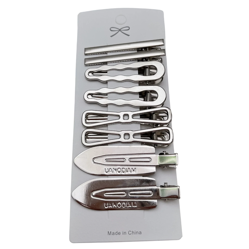 Käytännöllinen setti metallisia hiusklipsuja tarjoaa universaalin ratkaisun jokapäiväiseen hiusten muotoiluun. Paketissa on 8 kpl klipsuja eri pitkissä muodoissa – suorat klassiset vaihtoehdot, hienosti kiharat versiot ja leveämmät soikeat klipsit. Hopeinen metallipinta näyttää puhtaalta ja tyylikkäältä, joten se yhdistyy helposti mihin tahansa pukeutumistyyliin. Klipsut sopivat otsatukan kiinnittämiseen, sivusuortuvien tukemiseen sekä nopean ja yksinkertaisen kampauksen luomiseen muutamassa sekunnissa. Vankan rakenteen ansiosta hiukset pysyvät paikallaan ja ne ovat samalla mukavat käyttää.