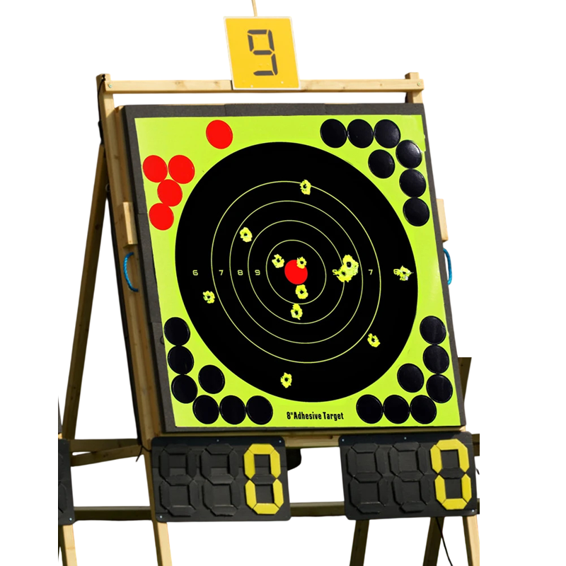 Reaktiiviset ampumataulut, joissa on voimakas roiskuminen helpottamaan osumien tarkkailua, itseliimautuva toteutus ja peittoteipit uudelleenkäyttöön. Täydellinen kuvaus