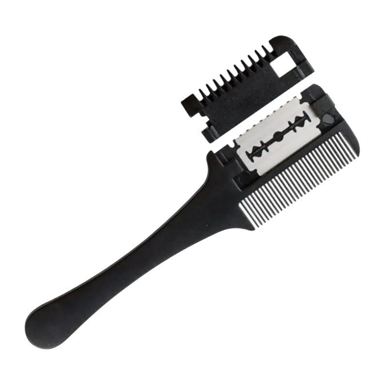 Tämä ammattimainen hiustenleikkuukampa on käytännöllinen työkalu, joka yhdistää klassisen kammauksen ja terävän terän toiminnallisuuden. Tämän yhdistelmän ansiosta se mahdollistaa helpon ja nopean leikkaamisen, ohentamisen ja muotoilun ilman monimutkaisia kampaamotyökaluja. Ergonominen musta kahva takaa mukavan otteen, kun taas terävät vaihdettavat terät mahdollistavat pitkäaikaisen ja tehokkaan käytön.