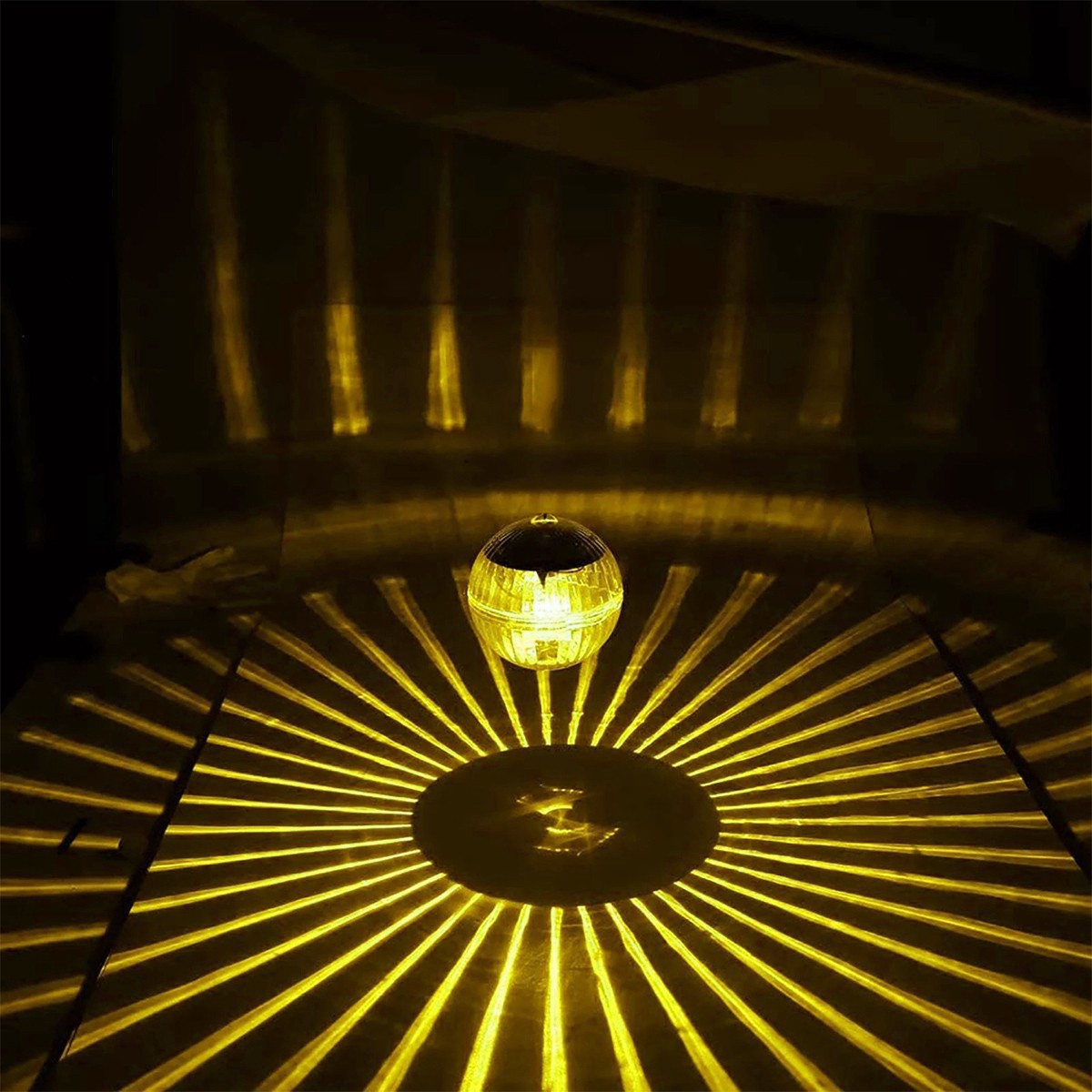 Aurinkoinen kelluva LED-valo, joka säteilee lämmintä keltaista valoa, automaattinen syttyminen hämärässä, vedenkestävä IP44 vesialueille. Täydellinen kuvaus