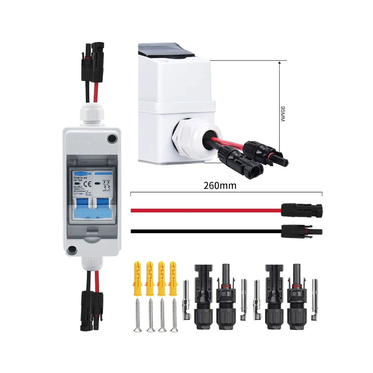 Aurinkosähkön FV HT-2WAY 2P 600 V 20 A 1 sisääntulo 1 lähtö IP65 Kestävä rakenne Vuotohälytys Jatkuva TOB9L-63WIFI Johto 27 cm Ulkokäyttöön