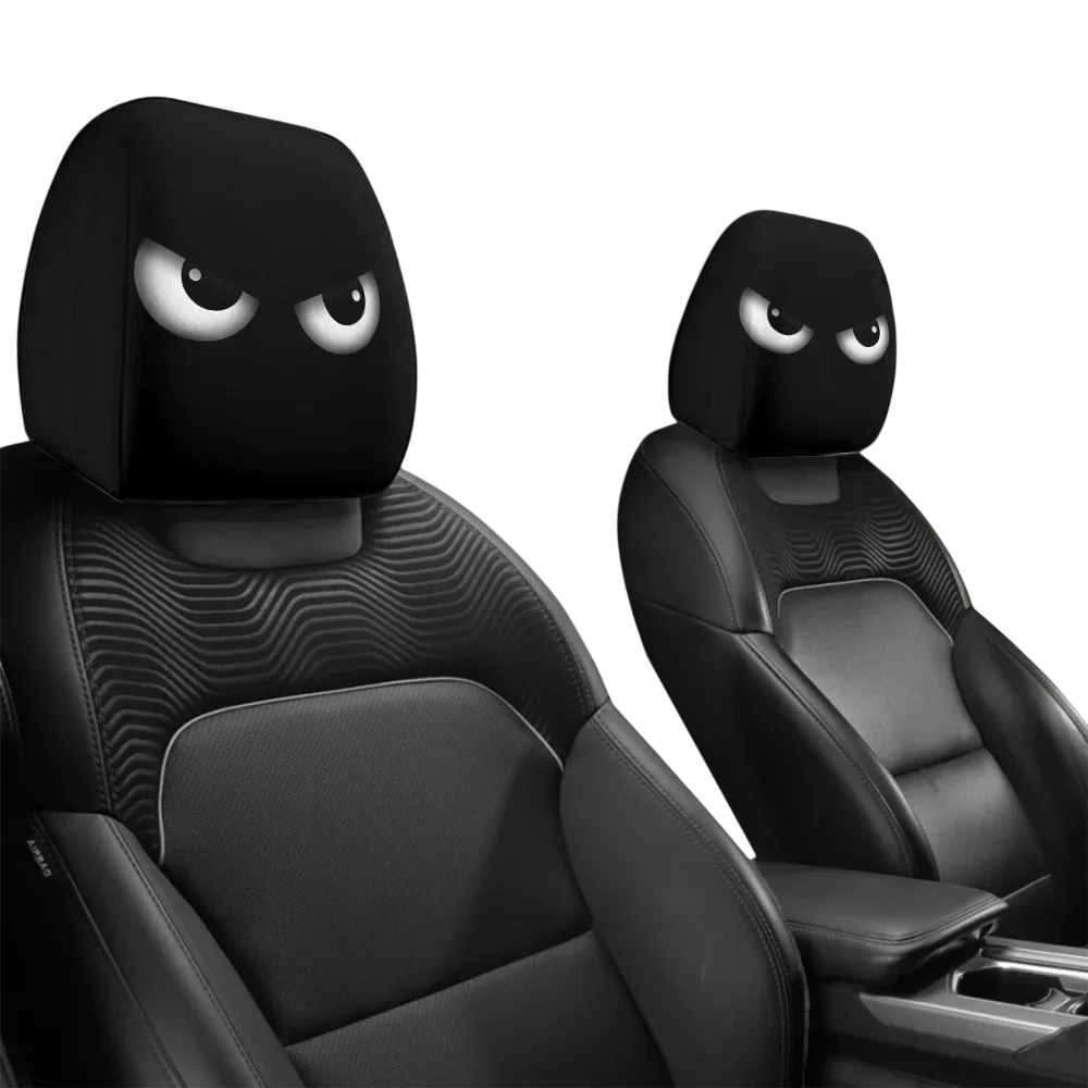 Dekoratiiviset pääntukikannet 28 x 26 cm valkoisilla silmillä mustassa kankaassa. 2 kpl setti, valmistettu polyesteristä, parantaa ajoneuvosi sisustusta. Täydellinen kuvaus