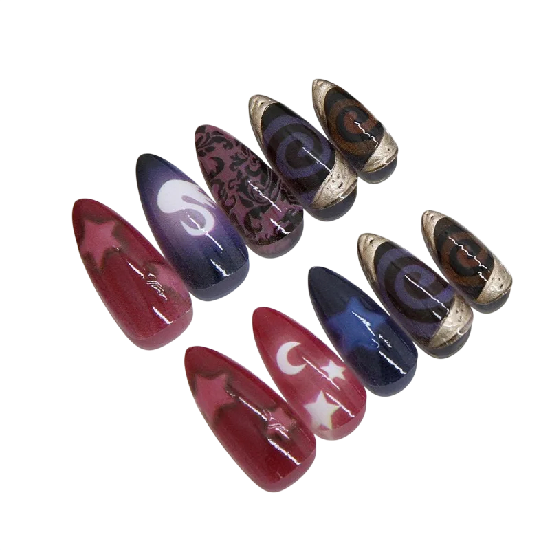 Koristekynnet kiiltävällä pinnalla ja suloisilla kuvioilla. Pakkaus sisältää tarvikkeet ja 12 kokoa täydellistä mukauttamista varten. Täydellinen kuvaus
