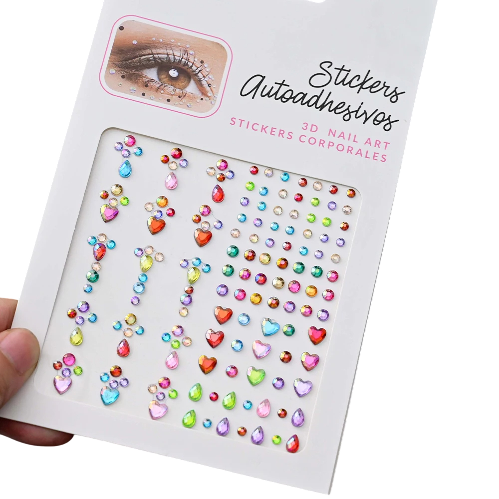 Värikkäitä 5D kiviä eri muodoissa kasvojen tai vartalon välittömään koristeluun, täydellinen festivaaleille, häihin, juhliin ja luovaan meikkiin. Täydellinen kuvaus