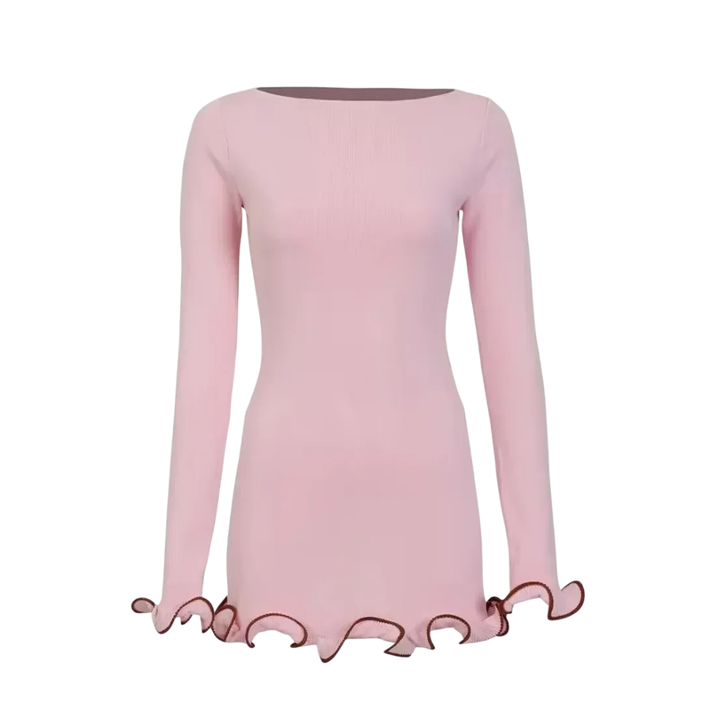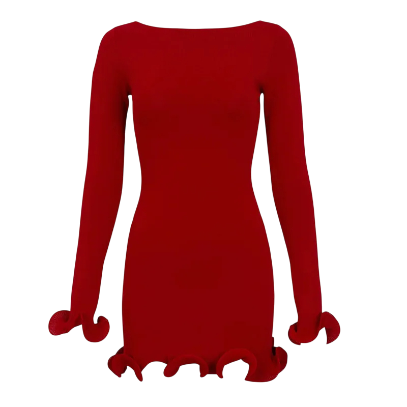 Tämä pitkähihainen, istuva minimekko aaltoilevilla koristeilla on ainutlaatuinen yhdistelmä naisellista eleganssia ja modernia tyyliä. Sileän ja syvään uurretun muotoilunsa ansiosta se sopii täydellisesti mihin tahansa tilaisuuteen, olipa kyseessä sitten juhlat, treffit tai sosiaalinen tapahtuma. Olkaimeton malli antaa puhtaan ja hienostuneen ilmeen, ja hihojen ja helman aaltoilevat reunukset lisäävät mekkoon leikkisyyttä.