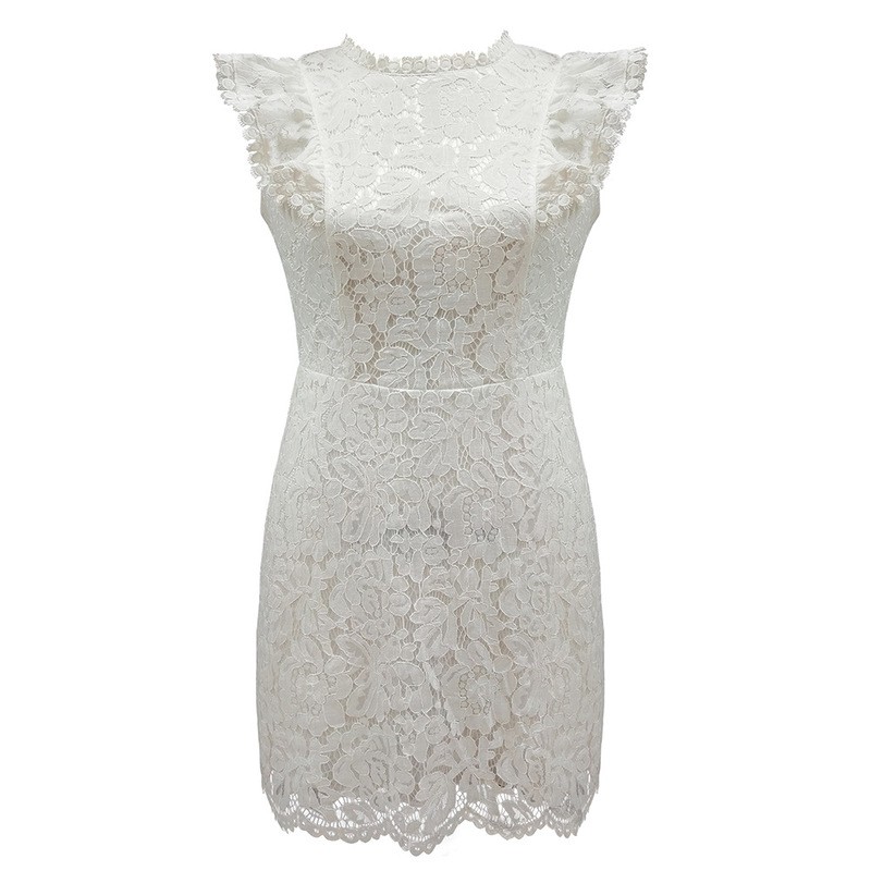 Tyylikäs naisten pitsimekko polven yläpuolelle, jossa röyhelöhihat.