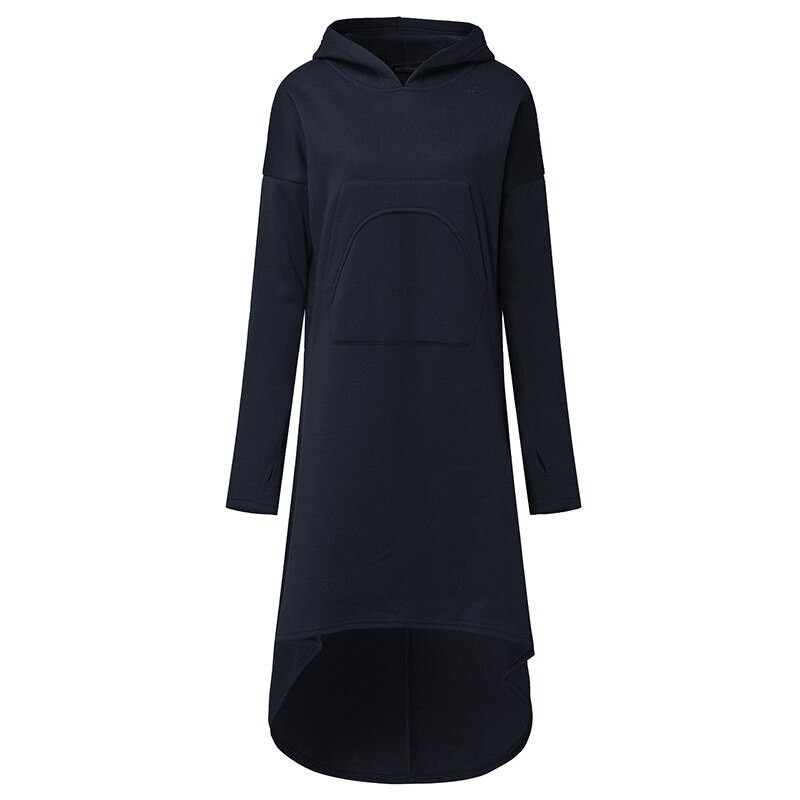 Tyylikäs syksyinen collegemekko, jossa on pitkät hihat ja huppu.