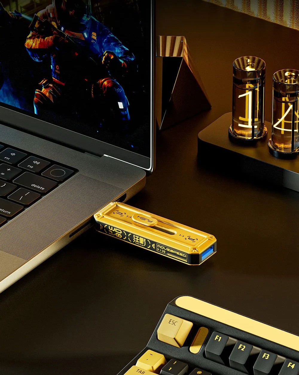 Flask-disk 1 TB USB 3.2 Gen 2 Typ C kaksipistokkeella, sinkkiseos, Mech Armor -muotoilu, liittimen vetämismahdollisuus, 72,3 mm x 23,5 mm x 13,1 mm