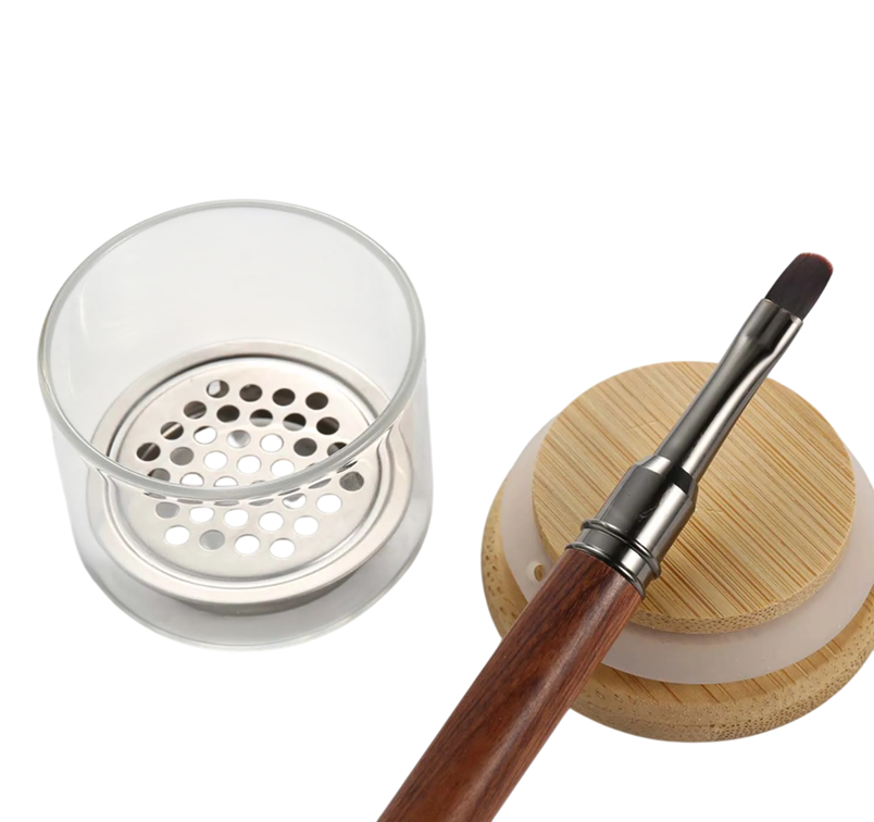 Harjasten puhdistuskulho 4,2 x 5,2 cm Kristallilasiastia ruostumattomalla sihdillä ja tiivistyskannella kynsien muotoiluun