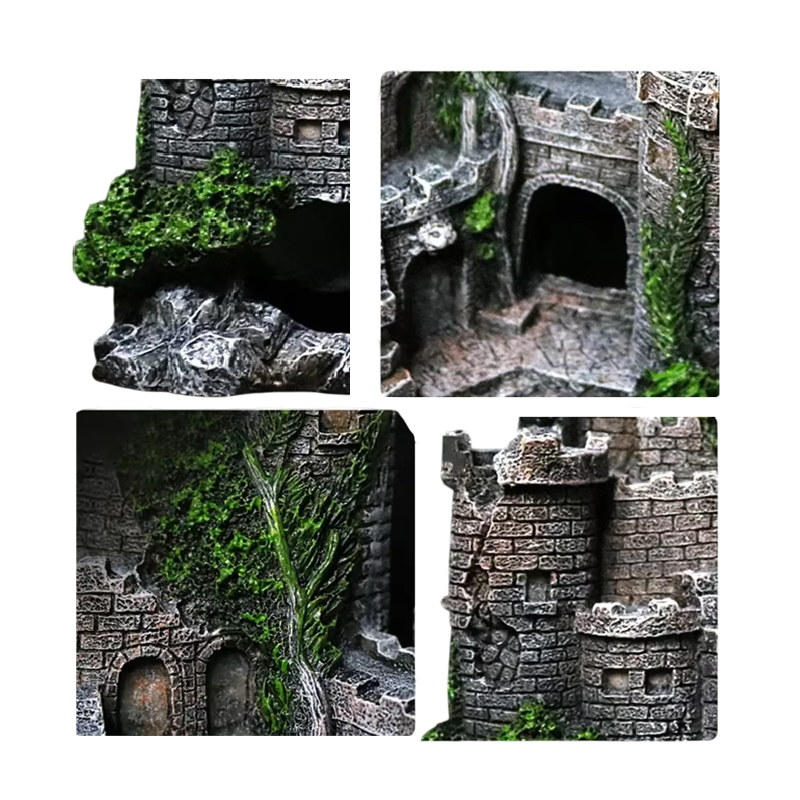 Tämä hartsikoriste, joka on muotoiltu muinaisen linnan mukaan, tuo akvaarioosi ripauksen historiaa ja fantasiaa. Se on suunniteltu tarjoamaan paitsi visuaalisesti houkutteleva elementti, myös käytännöllinen piilopaikka kaloille ja muille vesieläimille. Yksityiskohtainen toteutus, tekstuurit ja aukot luovat luonnollisen ympäristön, joka tukee kalojen luonnollista käyttäytymistä. Kestävä hartsimateriaali on turvallinen, myrkyttömä ja vedenkestävä, mikä takaa pitkän käyttöiän ja helpon huollon. Koko 17 x 6 x 13 cm on ihanteellinen keskikokoisiin akvaarioihin.