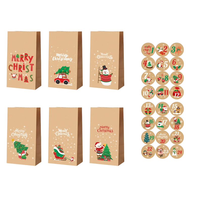 Joululahjasäkit 24 kpl 22 x 12 x 8 cm Retro kraft-paperiset pussit jouluteemoilla ja tarroilla