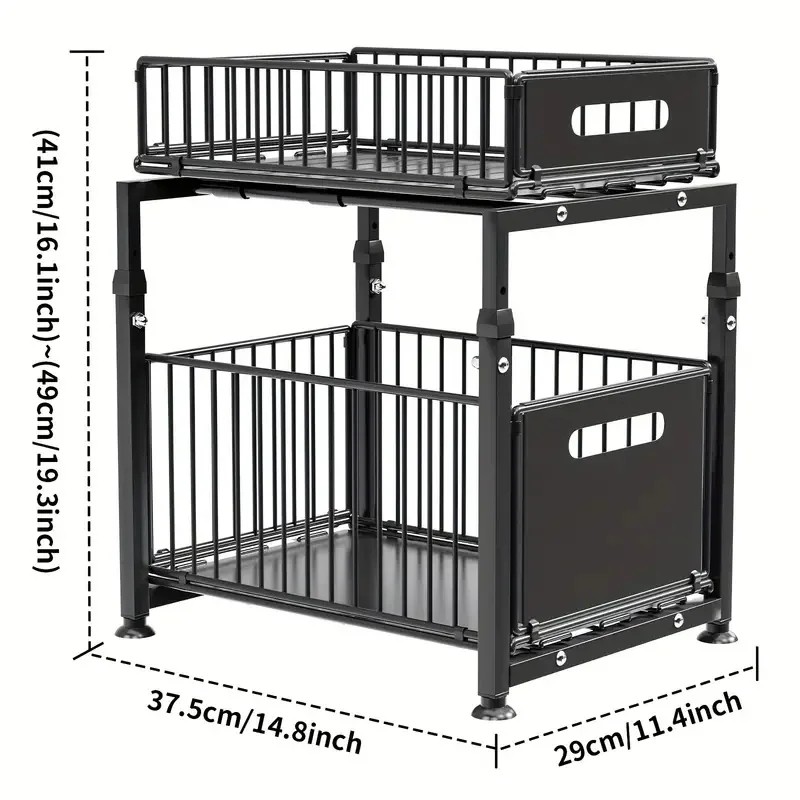 Kaksitasoinen keittiöjärjestelijä 37,5 x 29 x 41–49 cm Säädettävä metallihylly, jossa liukuvat korit Säilytysständi altaan alle ja työtasolle