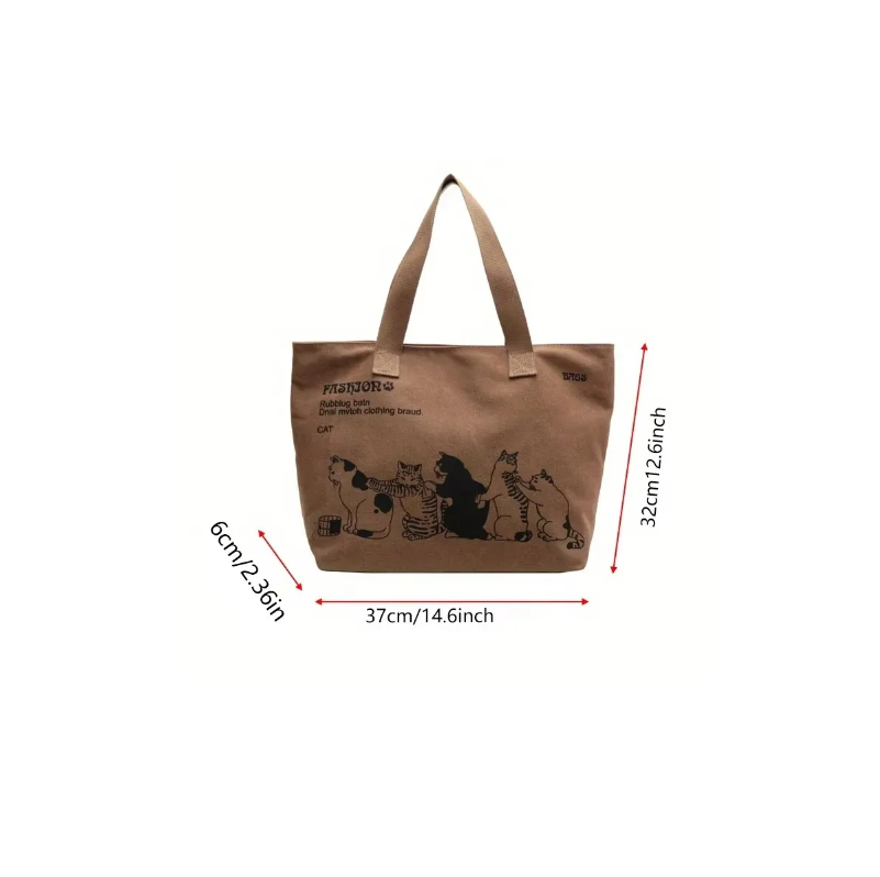 Tilava beigenvärinen laukku tukevasta kankaasta, jossa on hauska kissakuvio ja vetoketju. Täydellinen töihin, ostoksille ja jokapäiväiseen käyttöön. Täydellinen kuvaus