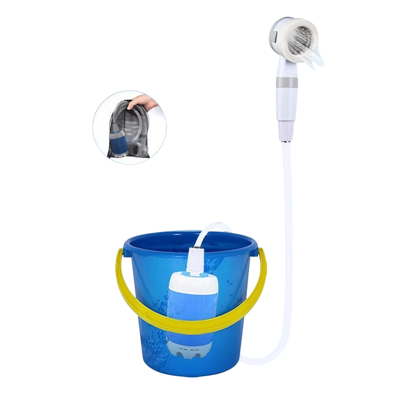 Käytännöllinen kannettava suihku ladattavalla akulla, hierontapäällä, autopesusuuttimella ja pitkällä letkulla on täydellinen telttailuun, puutarhaan ja matkailuun. Täydellinen kuvaus