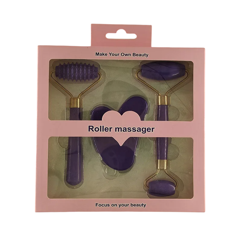 Kasvojen ja kehon hierontasarja 3 kpl Ripoitettu pyöreä rulla Tasainen kaksipäinen rulla Gua sha kaavin Hierontaväline