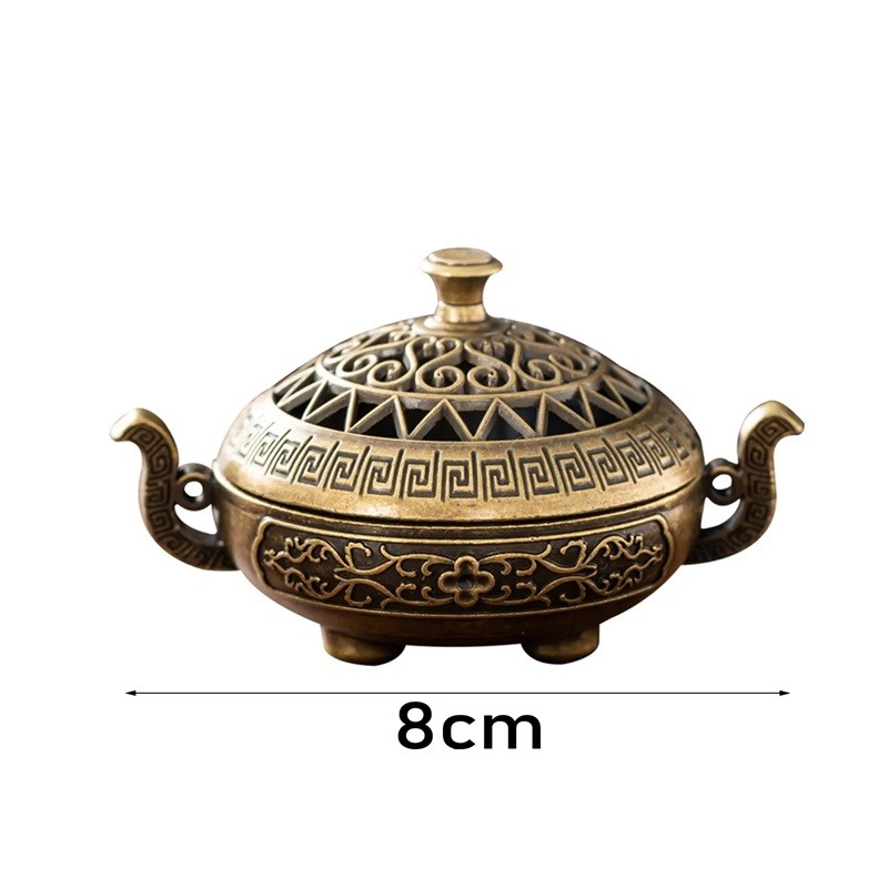 Tämä koristeellinen käytävälyhty kannella sopii tuoksukynttilöille ja perinteisille tikuilla. Kansi auttaa säätelemään savun vapautumista ja estää samalla tuhkan leviämistä ympäristöön. Vankka rakenne ja vakaa pohja takaavat turvallisen käytön päivittäisessä aromaterapiassa. Ajattoman muotoilunsa ansiosta se sopii sekä moderniin että perinteiseen sisustukseen.