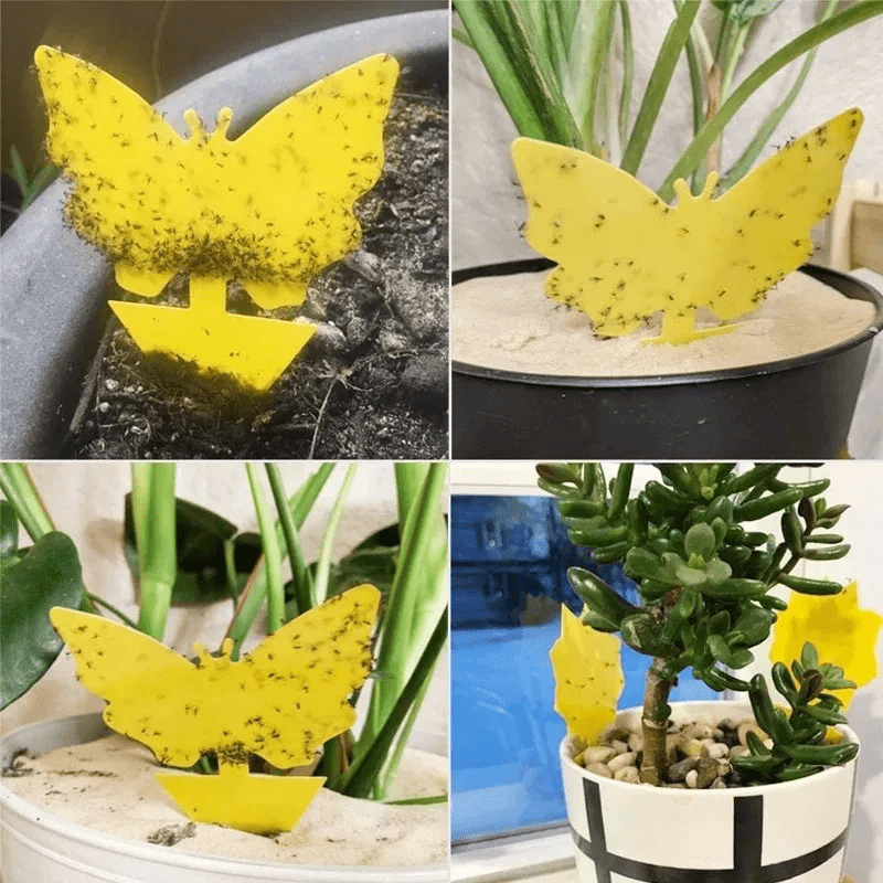 Nämä käytännölliset keltaiset liimapinnat hyönteisille ovat ihanteellinen tapa suojata sisä- ja ulkokasvejasi haitallisilta hyönteisiltä. Houkuttelevan keltaisen värinsä ansiosta ne vetävät tehokkaasti puoleensa aphideja, vaaleita, mustia kärpäsiä ja muita pieniä hyönteisiä, jotka sitten tarttuvat pinnalle. Liimapinnat on helppo työntää suoraan kukkaruukkuun ja ne toimivat samalla huomaamattomina koristeina perhosen ja auringonkukan muodossa.