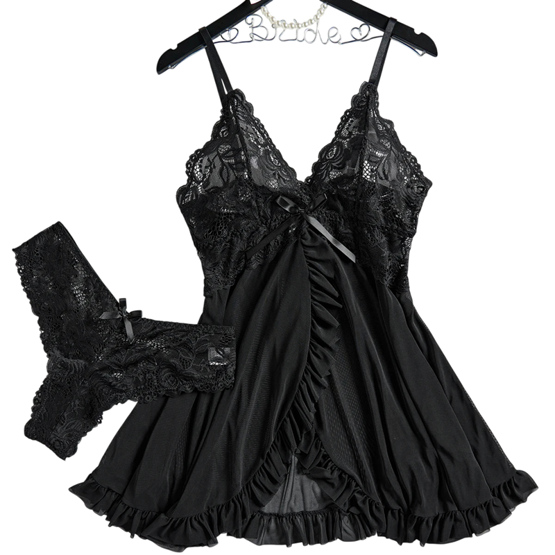 Tämä kesäinen seksikäs yöpuu, jossa on pitsiä, on täydellinen valinta naisille, jotka haluavat yhdistää tyylikkyyden, viettelevyyden ja mukavuuden. Valmistettu laadukkaasta pehmeästä ja läpinäkyvästä polyesterista, joka on miellyttävä kosketuksessa ja mukautuu täydellisesti vartaloon. Syvän V-mallisen kaula-aukon ja pitsiyksityiskohtien ansiosta se näyttää viettelevältä, mutta pysyy silti hienovaraisena ja naisellisena. Yöpuvussa on kevyt, löysä leikkaus, joka korostaa kaaria ja tarjoaa maksimaalista mukavuutta käytössä. Settiin kuuluu myös yhteensopivat stringit, jotka täydentävät koko seksikästä ilmettä.