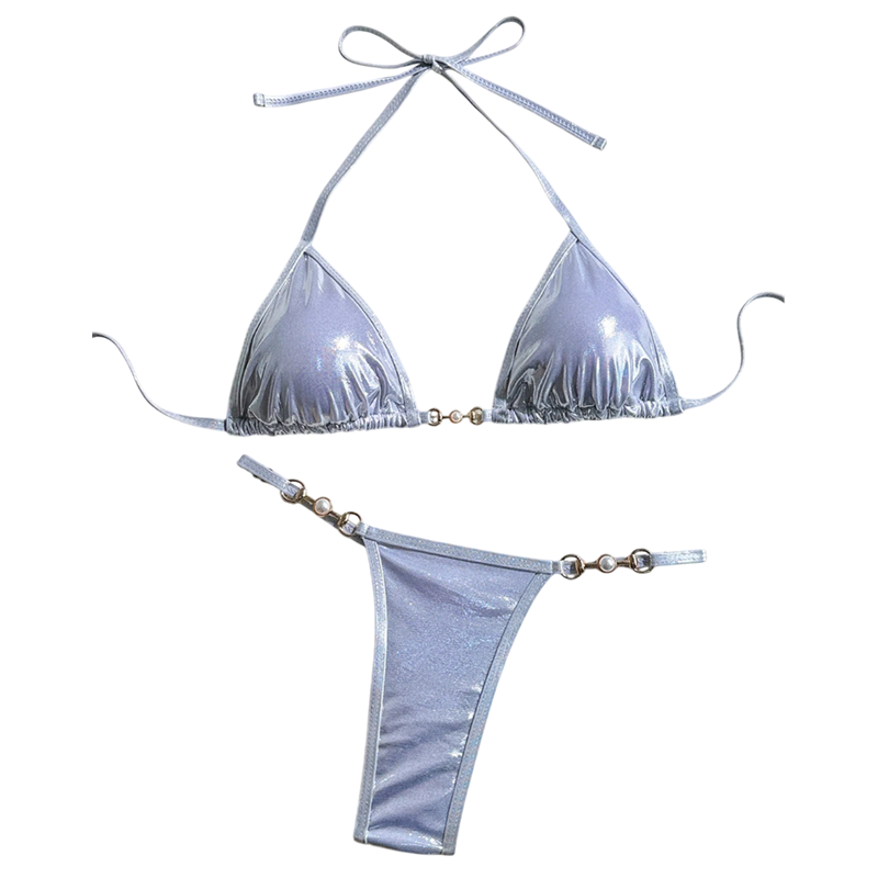Kiiltävä naisten bikini kolmioyläosalla ja helmiäisillä clutch-soljilla. Seksikäs string-leikkaus ja pitsikiinnitys. Ihanteellinen rannalle ja kuvauksiin.
