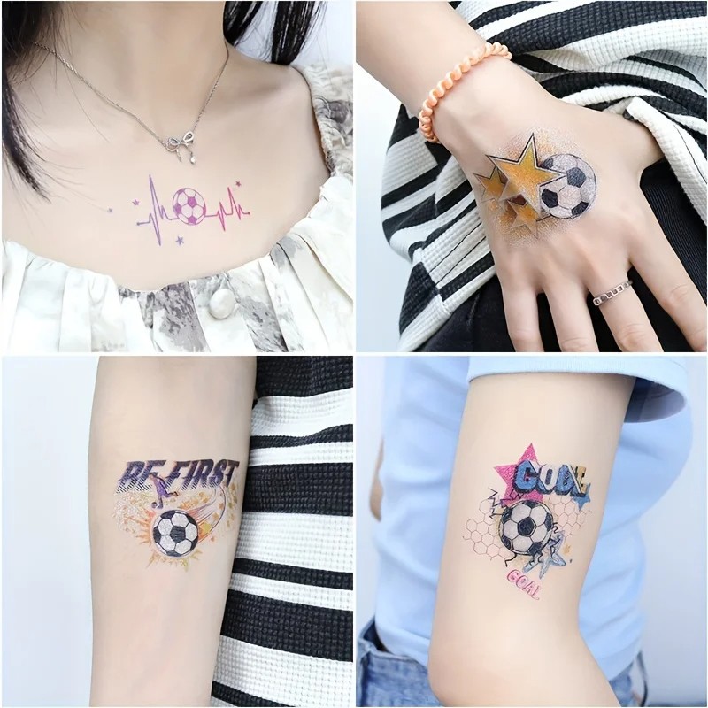 10 arkin setti väliaikaisia tatuointitarroja, joissa on alkuperäisiä jalkapalloteemoja vaaleanpunaisessa ja violetissa värissä, on täydellinen jalkapallon ystäville, urheilutapahtumiin ja teemajuhliin. Tatuoinnit on helppo levittää iholle, ja kimaltelevan efektin ansiosta ne kiinnittävät huomion heti. Teemat sisältävät jalkapalloja, kirjoituksia, tähtiä ja muita dynaamisia elementtejä, jotka antavat tyylillesi urheilullista ilmettä.