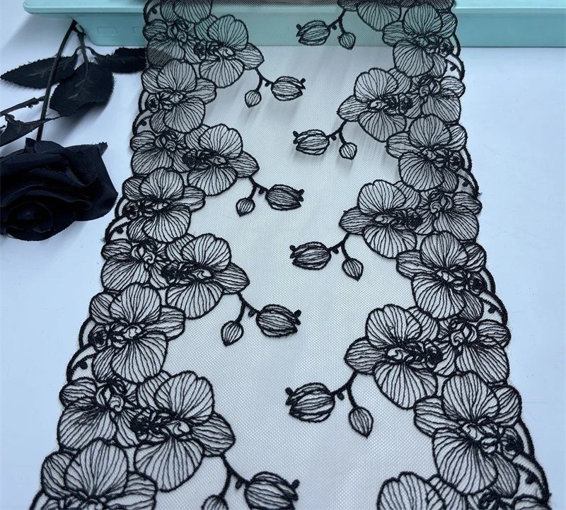 Tämä pitsi on ihanteellinen vaatteiden, hameiden, pukujen tai muotilisävarusteiden koristeluun. Se sopii myös erinomaisesti häiden koristeiden, kodin koristeiden tai ainutlaatuisten käsintehtyjen tuotteiden valmistukseen. Musta kirjailtu pitsi kasvimotiviinilla tuo jokaiselle projektille voimakkaan ja elegantin yksityiskohdan.