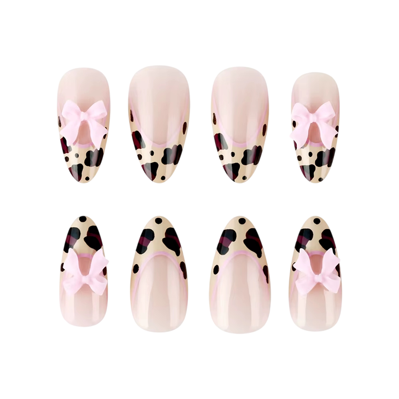 Tuokaa manikyyriinne ainutlaatuinen ja vangitseva ilme tällä 24 koristellun akryylikynnen setillä. Nämä kynnet on suunniteltu tarjoamaan realistinen ja ammattimainen ilme suoraan kotona tai salongissa. 12 eri koon ansiosta löydätte helposti sopivimman kynnen jokaiseen sormeen. Mantelin muoto antaa käsille elegantin ja pidennetyn vaikutelman, kun taas lehmänpilkkujen kuvio, jota täydentävät hienot 3D nauhat, tuo tyylikkään ja modernin vivahteen. Tämä setti on ihanteellinen sekä aloittelijoille että edistyneille käyttäjille, jotka haluavat saavuttaa salonkitason tuloksia.