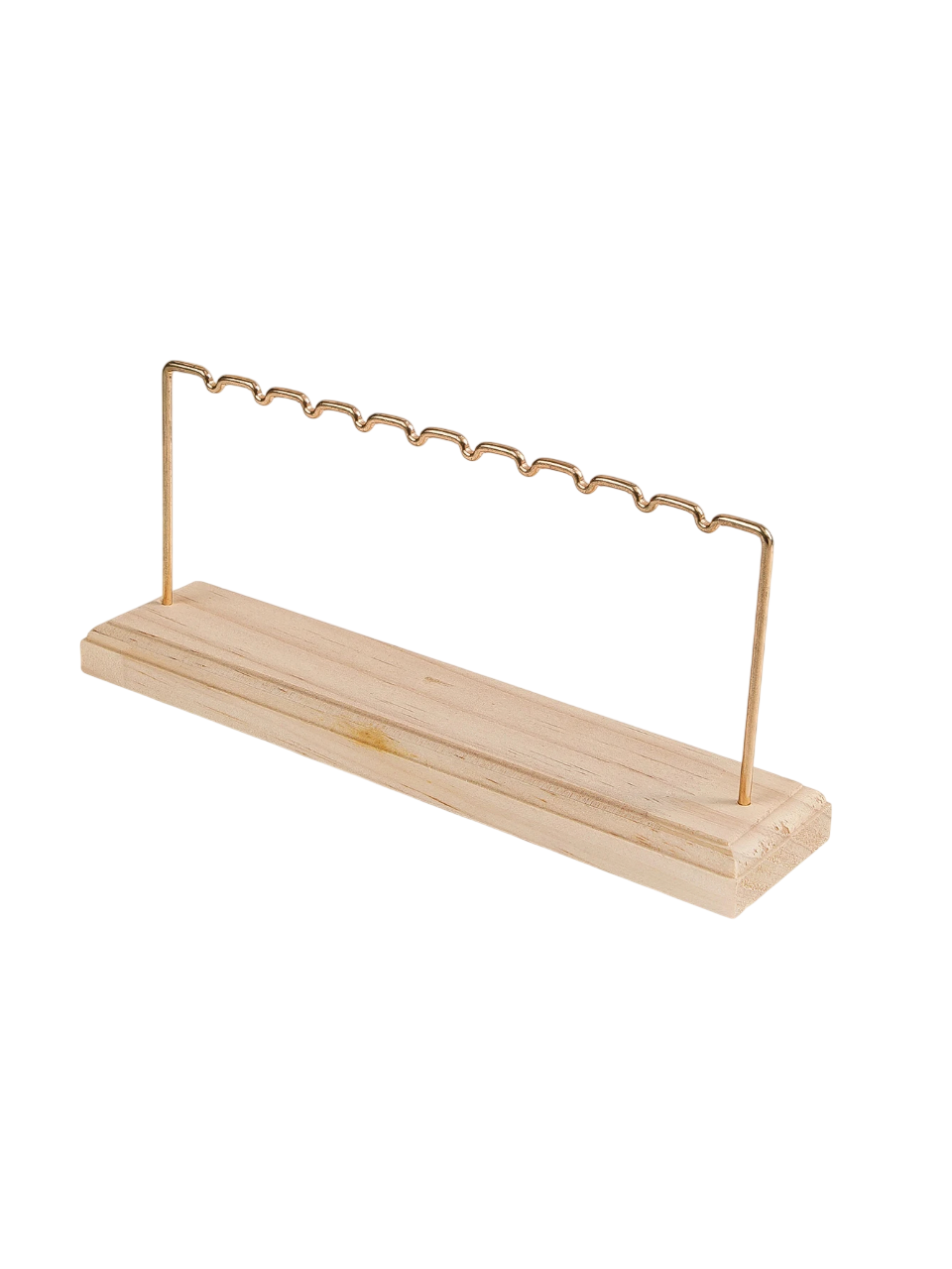 Pöytäteline korville puupohjalla ja metalliputkella, jossa on urat korujen selkeää ripustamista varten. Täydellinen kuvaus