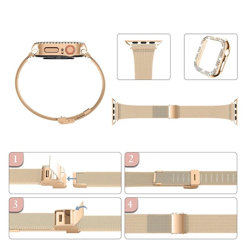 Tämä tyylikäs ruostumattomasta teräksestä valmistettu ranneke koristekivillä ja tarkasti muotoillulla suojakuorella antaa Apple Watchillesi poikkeuksellisen ylellisen ilmeen. Se on suunniteltu erityisesti Apple Watch Series 4, Series 5, Series 6 ja SE koossa 44 mm, mikä takaa täydellisen vakauden, tiukan kiinnityksen ja maksimaalisen mukavuuden päivittäisessä käytössä. Laadukas ruostumaton teräs tarjoaa pitkän käyttöiän, korkean kestävyyden ja tyylikkään kiillon, kun taas koristekivet luovat hienostuneen visuaalisen yksityiskohdan. Suojakuori suojaa kellon koko runkoa, sen reunoja ja näytön kehystä iskuilta, naarmuilta ja tavallisilta vaurioilta.