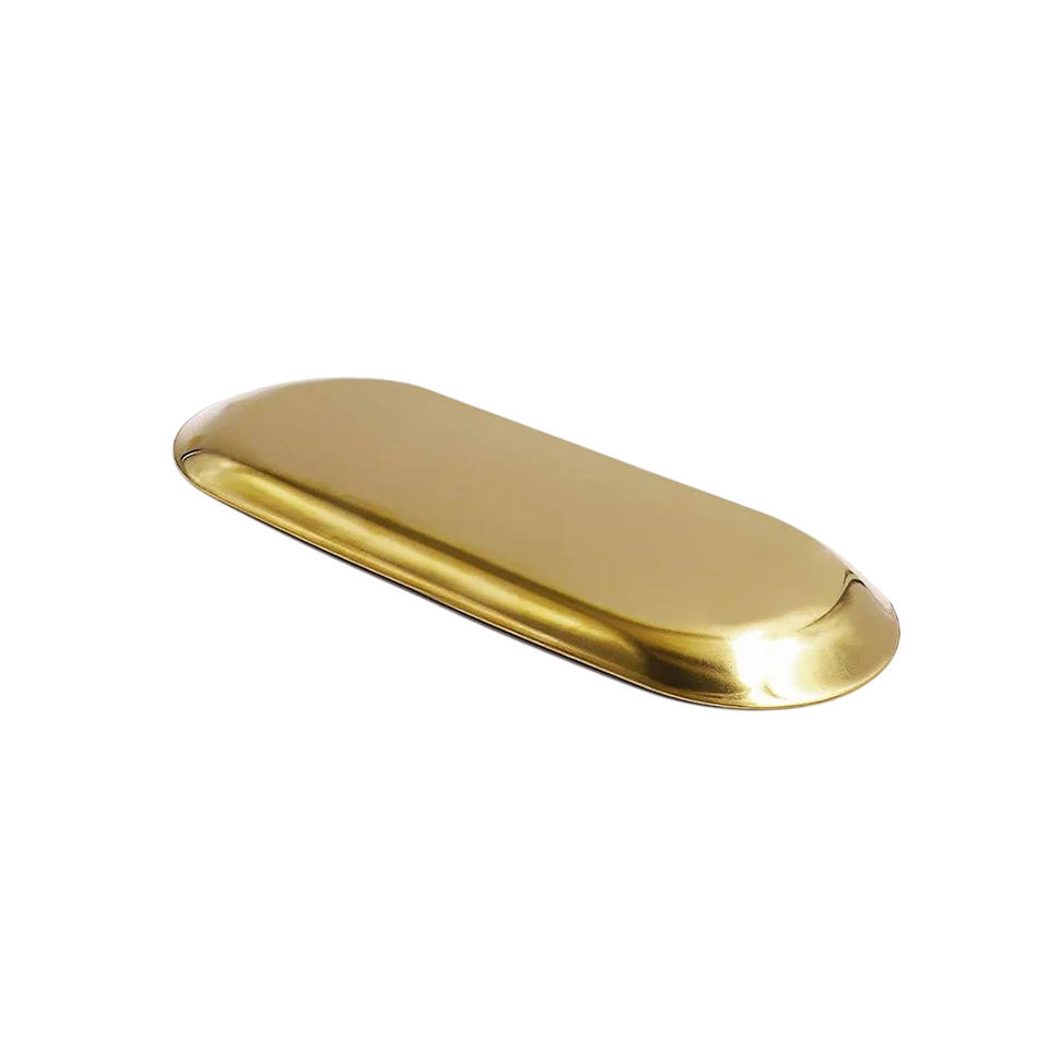 Designsäilytysalusta elegantissa kultaisessa toteutuksessa on käytännöllinen lisä, joka toimii samalla tyylikkäänä koristeena. Modernin ilmeen ansiosta se sulautuu helposti makuuhuoneeseen, kylpyhuoneeseen, käytävään tai olohuoneeseen. Tarjotin tarjoaa riittävästi tilaa korujen, hajuvesien, kosmetiikan, avainten tai muiden pienten lisävarusteiden säilyttämiseen. Minimalistinen muotoilu on puhdas ja ajaton, mikä mahdollistaa helpon yhteensovittamisen eri tyyppisten sisustusten kanssa. Laadukas valmistus takaa kestävyyden ja pitkäaikaisen käytön ilman esteettisen ilmeen heikkenemistä.