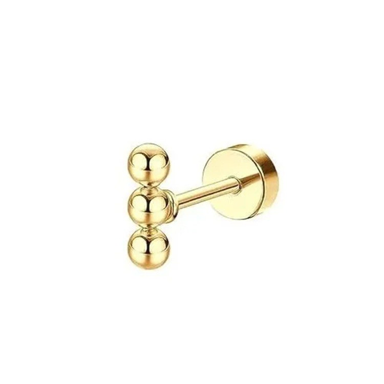 Hieno kultainen piercing kirurgisesta teräksestä, jossa on kolmen pallon päällekkäin oleva motiivi, mitat 6 x 5 x 0,8 mm moderniin ja puhtaaseen ilmeeseen. Täydellinen kuvaus