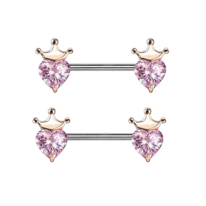 Kiiltävä pari nänni koristeita sydämellä ja kruunulla yhdistää hienon kimmellyksen, naisellisen eleganssin ja näyttävän yksityiskohdan persoonalliseen tyyliin. Täydellinen kuvaus