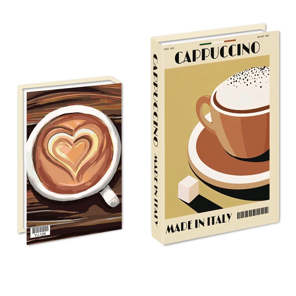 Designattu kuvitteellinen kirja Cappuccino viehättää alkuperäisellä kahvikupin ja latte art sydämen motiivilla sekä modernilla graafisella toteutuksella. Elegantti beige-ruskea toteutus luo kodikkaan ja tyylikkään tunnelman, joten se sopii täydellisesti kahvilatunnelmaa inspiroivaan sisustukseen. Ensisilmäyksellä se näyttää teemakirjalta kahvista tai gastronomiasta.